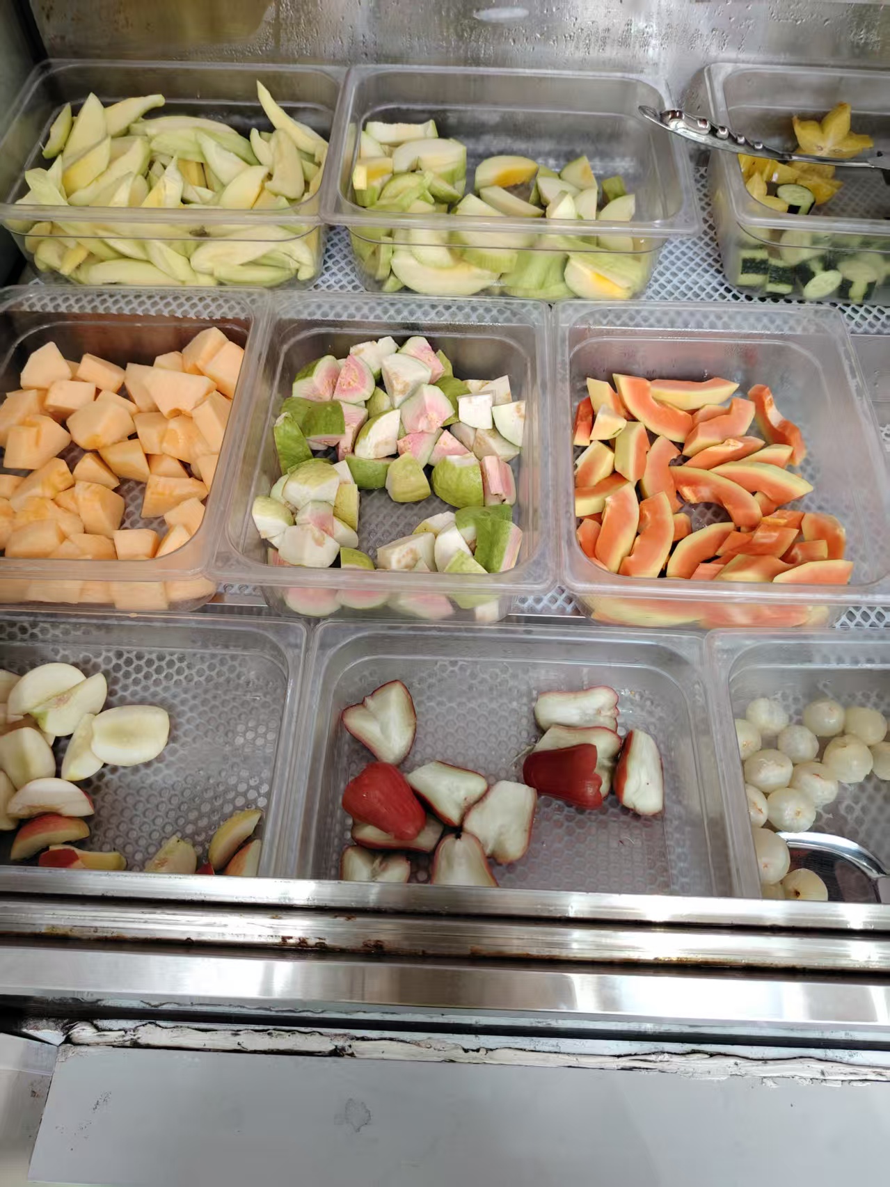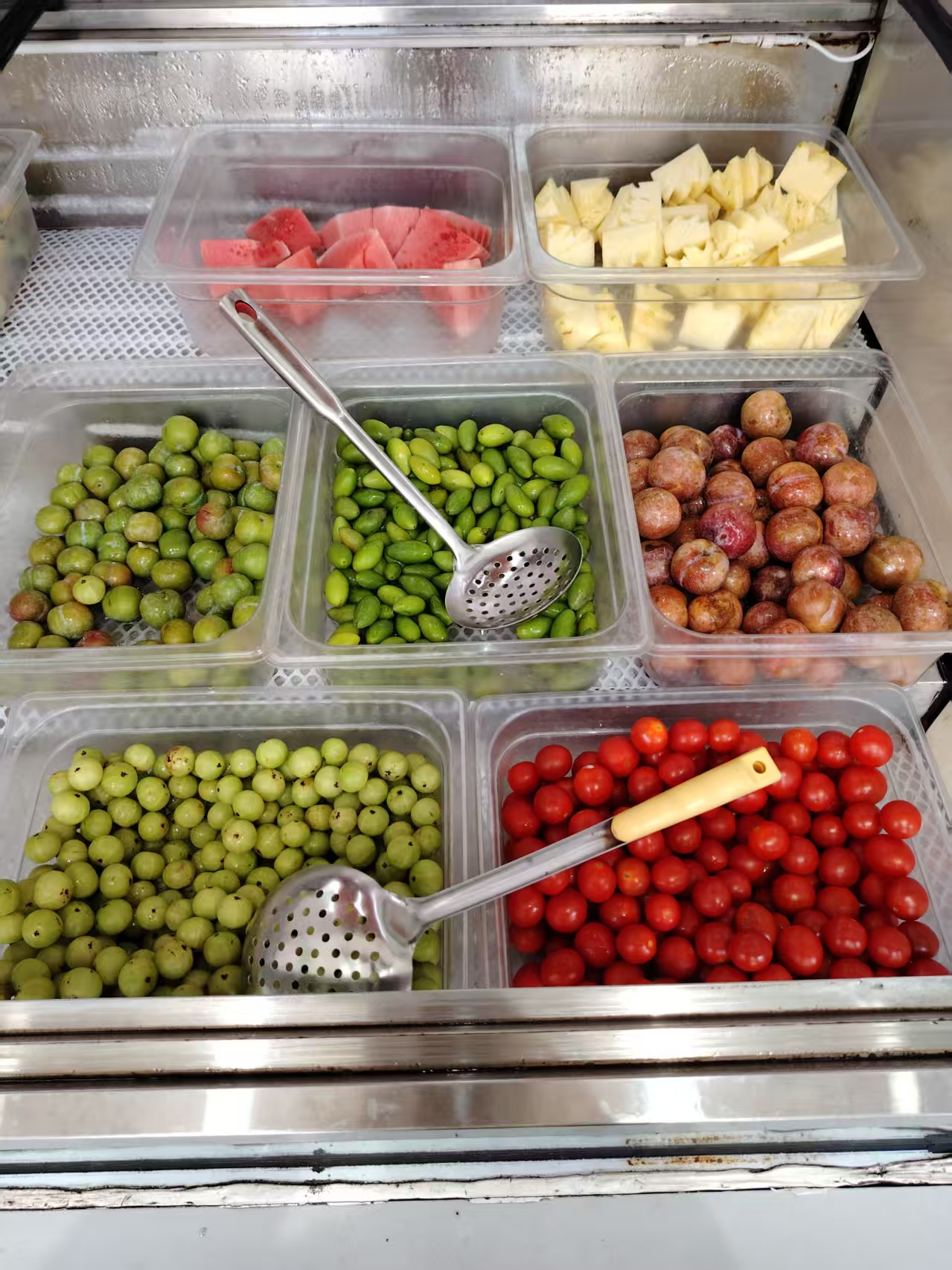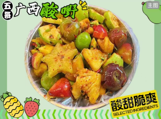 五哥广西酸嘢的菜品丰富多样,有各类水果,如李子、芒果、草莓等,也有蔬菜类,如黄瓜、萝卜等。每一道菜品都经过精心挑选和腌制,五哥独特的调味配方使得酸嘢既保留了食材的原味,又增添了独特的酸辣风味。